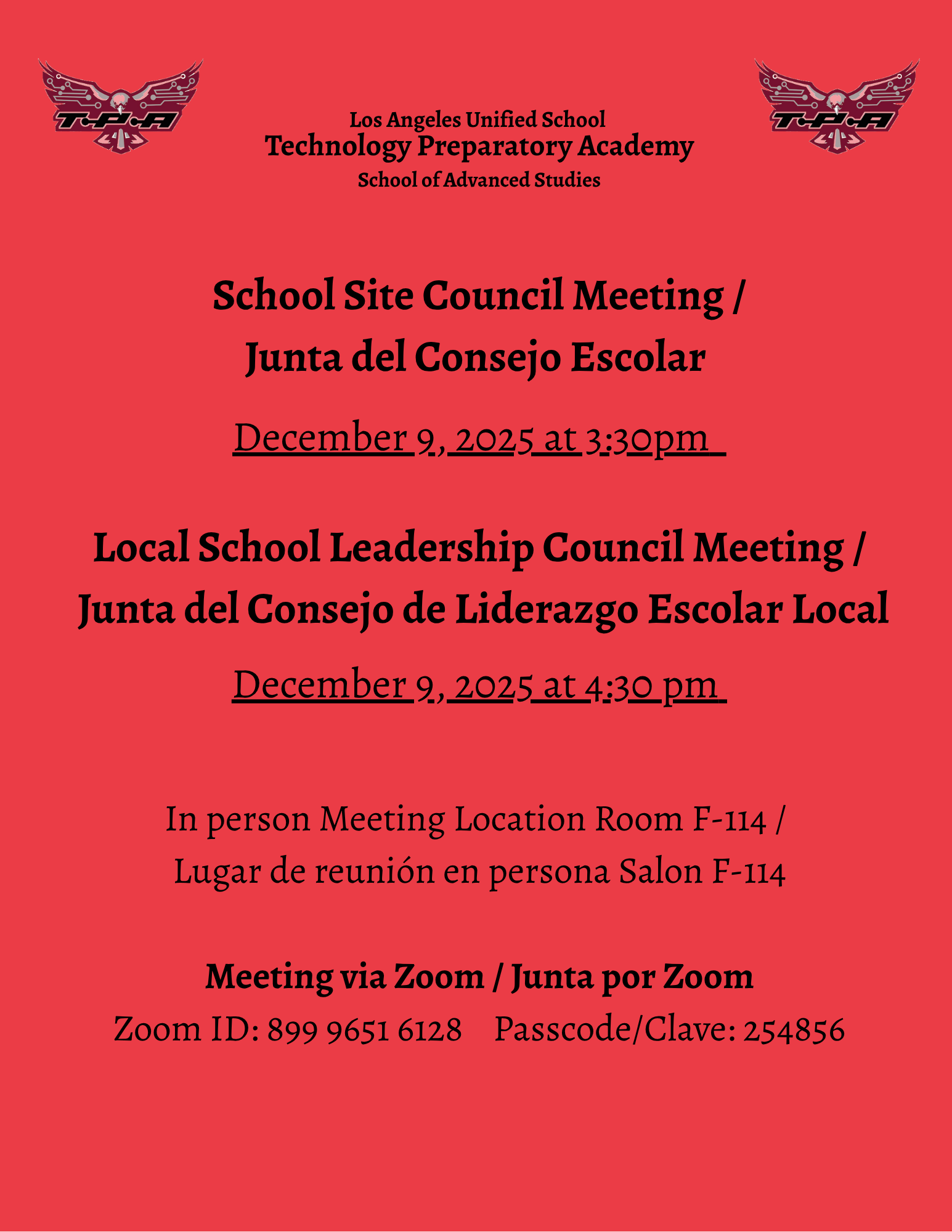 School Site Council Meeting on December 9, 2025 at 3:30pm. School Leadership Council Meeting at 4:30pm in Room F-114 / Junta del Consejo Escolar el 9 de deciembre 2025 a las 3:30pm. Junta de Liderazgo Escolar a las 4:30pm en el Salón F-114